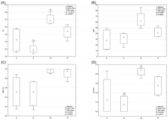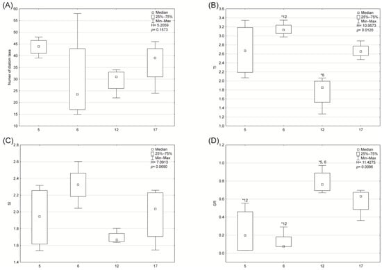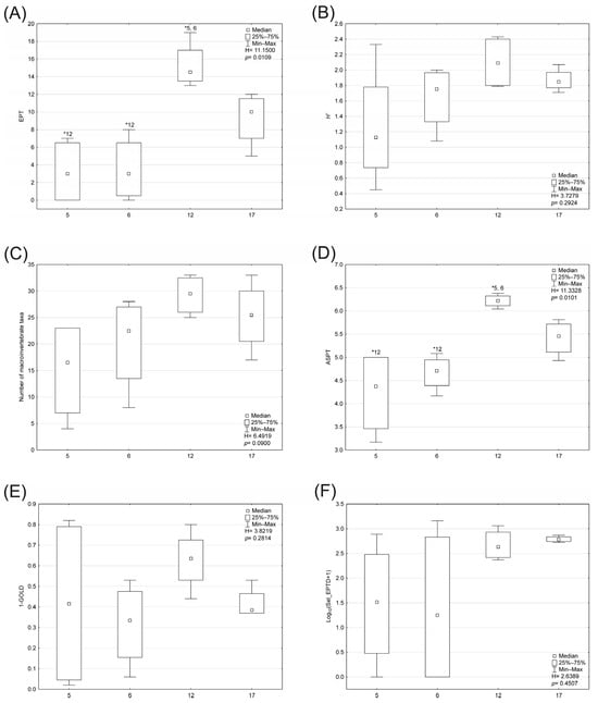 Values of components of the Polish multimetric index for macroinvertebrates (MMI_PL) for the abiotic types of rivers (5, 6, 12, 17). * Asterisks above a whisker denote significant differences between the abiotic types of rivers. Abbreviations: (A) EPT index—the total number of families in the Ephemeroptera, Plecoptera and Trichoptera taxa; (B) H′—Shannon–Wiener index; (C) the number of benthic macroinvertebrate taxa; (D) ASPT index—Average Score per Taxon; (E) 1-GOLD index—the relative abundance of Gastropoda, Oligochaeta and Diptera; (F) Log10(Sel_EPTD + 1) − index log10 (sum of individuals of the families Heptageniidae, Ephemeridae, Leptophlebiidae, Brachycentridae, Georidae, Polycentropodidae, Limnephilidae, Odontoceridae, Dolichopodidae, Stratiomyidae, Dixidae, Empididae, Athericidae, Nemouridae + 1).