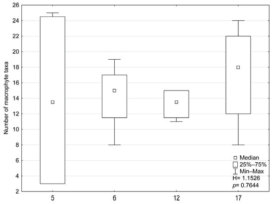 Macrophyte Index for Rivers values also differed significantly between types of rivers (p < 0.05). MIR values were highest in type 12 (flysch rivers) and lowest in types 5 and 6. Although the total number of macrophyte taxa were lowest in flysch rivers, species richness did not differ significantly between types of rivers (p > 0.05, Figure 3). A varying number of macrophyte taxa were recorded across abiotic types of rivers, ranging from 3 to 39 taxa. These included type 5 (3 taxa in the Bolina River and 39 taxa in the Centuria River), type 6 (25 taxa in the Mitręga River and 19 taxa in the Mleczna River), type 12 (24 taxa in the Dziechcinka River and 18 taxa in the Vistula River), and type 17 variants (33 taxa in the Korzenica River and 22 taxa in the Wiercica River).