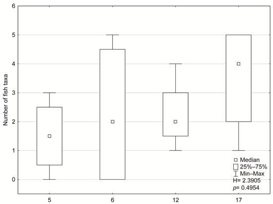 Fish-based assessments using the EFI + PL index also revealed significant differences among types of rivers (p < 0.05). The number of fish taxa varied significantly among abiotic types of rivers (p = 0.4954, Figure 5). A varying number of fish taxa were recorded across abiotic types of rivers, ranging from 0 to 8 taxa. These included type 5 (1 taxon in the Bolina River and 4 taxa in the Centuria River), type 6 (8 taxa in the Mitręga River and 0 taxa in the Mleczna River), type 12 (2 taxa in the Dziechcinka River and 4 taxa in the Vistula River), and type 17 variants (7 taxa in the Korzenica River and 4 taxa in the Wiercica River).