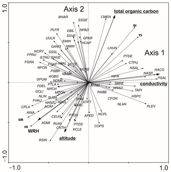 - Diatoms: The RDA analysis based on diatom taxa and environmental variables showed that the first two axes explained 28.5% of the variance in biological data and 71.7% of the variance in species–environment relationships. According to forward selection, conductivity, TOC, and altitude were the most strongly associated variables (statistically significant) with the distribution of diatom taxa and biotic metrics (Figure 6). Three distinct patterns were identified: (1) the distribution of Pleurosigma salinarum, Halamphora coffeaeformis, Navicula flandriae, N. salinarum var. salinarum, Pleurosira laevis var. laevis, Haslea spicula, N. lanceolata, and Surirella brebissonii was positively associated with conductivity; (2) Cyclotella meneghiniana, Lemnicola hungarica, and the values of SI and TI indices were positively correlated with TOC; (3) Amphora inariensis, Reimeria uniseriata, Cocconeis neothumensis, C. placentula var. placentula, C. euglypta, and the GR and IO index values were positively associated with altitude and WRH. The relationship between diatom composition and environmental variables was statistically significant (Monte Carlo test for the first canonical axis: p = 0.006, F = 2.071; for all canonical axes: p = 0.002, F = 1.810).
