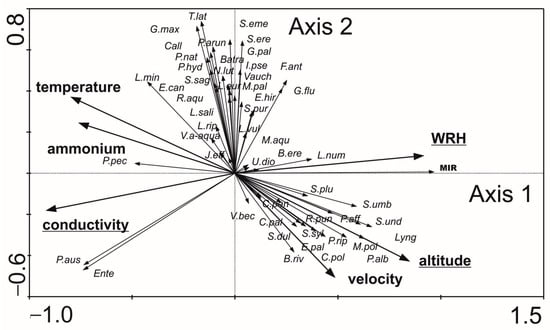 Figure 7. Ordination diagram (biplot) based on redundancy analysis (RDA) of macrophyte species, biotic metrics, and selected environmental variables (statistically significant environmental variables are underlined). Abbreviations: B.ere—Berula erecta, B.riv—Brachythecium rivulare, Batra—Batrachyspermum sp., C.pal—Caltha palustris, C.pan—Carex paniculata, C.pol—Cochlearia polonica, Call—Callitriche sp., E.can—Elodea canadensis, E.hir—Epilobium hirsutum, E.pal—Equisetum palustre, Ente—Enteromorpha sp., F.ant—Fontinalis antipyretica, G.flu—Glyceria fluitans, G.max—Glyceria maxima, G.pal—Galium palustre, I.pse—Iris pseudoacorus, J.eff—Juncus effusus, L.eur—Lycopus europaeus, L.min—Lemna minor, L.num—Lysimachia nummularia, L.rip—Leptodictyum riparium, L.sali—Lythrum salicaria, L.vul—Lysimachia vulgaris, Lyng—Lyngbya sp., M.aqu—Mentha aquatica, M.pal—Myosotis palustris, M.pol—Marchantia polymorpha, N.lut—Nuphar lutea, P.aff—Plagiomnium affine, P.alb—Petasites albus, P.arun—Phalaris arundinacea, P.aus—Phragmites australis, P.hyd—Polygonum hydropiper, P.nat—Potamogeton natans, P.pec—Potamogeton pectinatus, P.rip—Platyhypnidium riparioides, R.aqu—Ranunculus aquatilis, R.pun—Rhizomnium punctatum, S.dul—Solanum dulcamara, S.eme—Sparganium emersum, S.ere—Sparganium erectum, S.plu—Sciuro-hypnum plumosum, S.pur—Salix purpurea, S.sag—Sagittaria sagittifolia, S.syl—Scirpus sylvaticus, S.umb—Scrophularia umbrosa, S.und—Scapania undulata, T.lat—Typha latifolia, U.dio—Urtica dioica, V.a-aqua—Veronica anagallis-aquatica, V.bec—Veronica beccabunga, Vauch—Vaucheria sp., WRH—Hydromorphological Diversity Index, MIR—Macrophyte Index for Rivers. - Benthic macroinvertebrates: RDA showed that the first two axes explained 45.7% of the variance in biological data and 70.6% in species–environment relationships. Conductivity, alkalinity, and WRH were the most significant variables affecting macroinvertebrate distribution and biotic metrics (Figure 8). Three distribution patterns were established: (1) Hydrobiidae, Oligochaeta, Hydrophilidae, and Coenagrionidae were positively associated with higher conductivity, alkalinity, and temperature; (2) Gammaridae, Dixidae, Sericostomatidae, Glossosomatidae, Rhyacophilidae, and Odontoceridae were associated with altitude and coarse substrates (gravel and pebble); (3) the abundance of Ancylidae, Goeridae, Polycentropodidae, Lepidostomatidae, Limnephilidae, Chloroperlidae, Nemouridae, Leptophlebiidae, Baetidae, and Heptageniidae, along with high values of biotic metrics such as ASPT, 1-GOLD, H’, MMI_PL, and log10(Sel_EPTD + 1), was positively correlated with WRH. The relationship was statistically significant (Monte Carlo test for the first axis: p = 0.002, F = 2.814; for all axes: p = 0.002, F = 2.103).