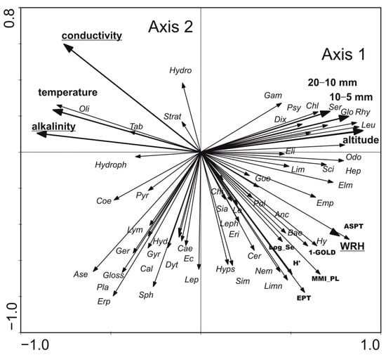 Figure 8. Ordination diagram (biplot) based on redundancy analysis (RDA) of benthic macroinvertebrate taxa, biotic metrics, and selected environmental variables (statistically significant environmental variables are underlined). Abbreviations: Anc—Ancylidae; Ase—Asellidae; Bae—Baetidae; Cae—Caenidae; Cal—Calopterigidae; Cer—Ceratopogonidae; Chi—Chironomidae; Chl—Chloroperlidae; Coe—Coenagrionidae; Dix—Dixidae; Dyt—Dytiscidae; Ec—Ecnomidae; Elm—Elmidae; Emp—Empididae; Eli—Ephemerellidae; Eri—Ephemeridae; Erp—Erpobdellidae; Gam—Gammaridae; Ger—Gerridae; Gloss—Glossiphonidae; Glo—Glossosomatidae; Goe—Goeridae; Gyr—Gyrynidae; Hep—Heptageniidae; Hy—Hydrachnida; Hydro—Hydrobiidae; Hydroph—Hydrophilidae; Hyps—Hydropsychidae; Hyd—Hydroptilidae; Le—Lepidostomatidae; Lep—Leptoceridae; Leph—Leptophlebidae; Leu—Leuctridae; Limn—Limnephilidae; Lim—Limonidae; Lym—Lymnaeidae; Nem—Nemouridae; Odo—Odontoceridae; Oli—Oligochaeta; Pla—Planorbidae; Pol—Polycentropodidae; Psy—Psychodidae; Pyr—Pyralidae; Rhy—Rhyacophilidae; Sci—Scirtidae; Ser—Sericostomatidae; Sia—Sialidae; Sim—Simuliidae; Sph—Sphaeriidae; Strat—Stratiomyidae; Tab—Tabanidae; 5–10, 10–20 mm—coarse substrates (gravel and pebble); WRH—Hydromorphological Diversity Index; MMI_PL—multimetric index for macroinvertebrates; MMI_PL: EPT—total number of families in the Ephemeroptera, Plecoptera and Trichoptera taxa; H’—Shannon–Wiener index; ASPT—Average Score per Taxon; Log_Se—log10 of sum of selected families. - Fish: The first two axes explained 32.1% of the variance in biological data and 72.9% in species–environment relationships in CCA analysis (Figure 9). Conductivity, dissolved oxygen, and nitrite concentration were the most significant variables. Gasterosteus aculeatus abundance was positively correlated with increasing conductivity. Salmo trutta fario, Phoxinus phoxinus, Cottus poecilopus, and Barbatula barbatula, as well as EFI + PL index values and total species number, were positively associated with a higher dissolved oxygen and WRH. The relationship between fish composition and environmental variables was statistically significant (Monte Carlo test for the first canonical axis: p = 0.006, F = 2.528; for all axes: p = 0.004, F = 2.165).
