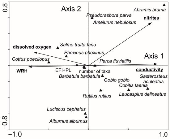 Figure 9. Ordination diagram (biplot) based on canonical correspondence analysis (CCA) of fish species, biotic metrics, and selected environmental variables (statistically significant environmental variables are underlined). Abbreviations: WRH—Hydromorphological Diversity Index.