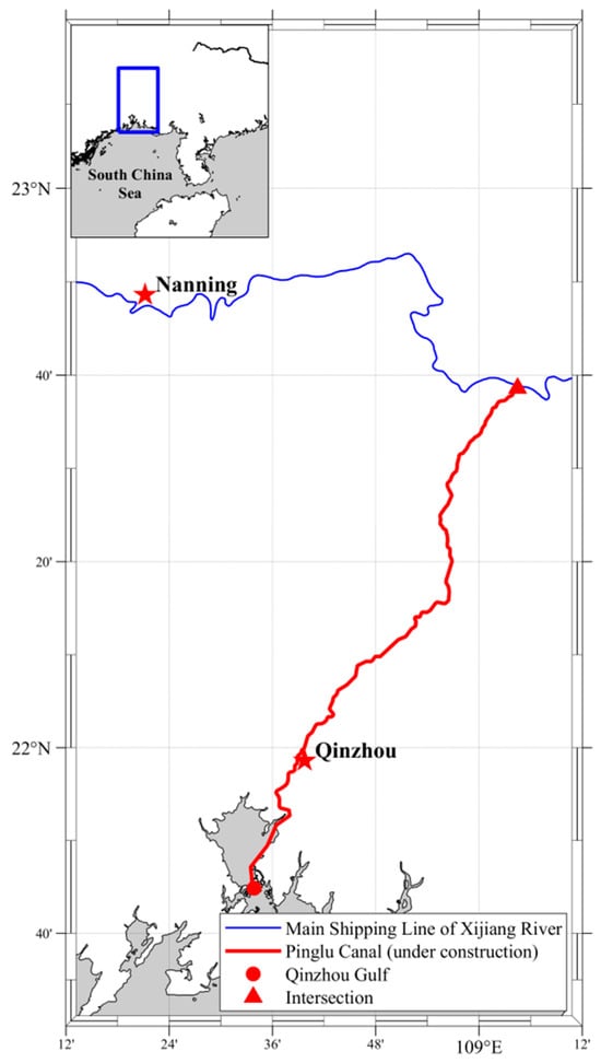 Schematic diagram of the geographical location of the Pinglu Canal, which connects the Xijiang River with Qinzhou Gulf.