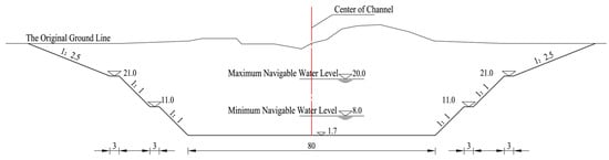 Considering the construction conditions of this project and its long-term development trend, the increase in the cross-sectional area of the waterway will mainly be achieved by expanding the width of the waterway, with a small increase in water depth, thus forming a wide and shallow waterway cross-section. Since the Pinglu Canal is constructed to the standards of an inland waterway of Grade I, the specific dimensions of the waterway cross-section are presented in Figure 2. For this cross-section, the normal water level is 8.7 m.