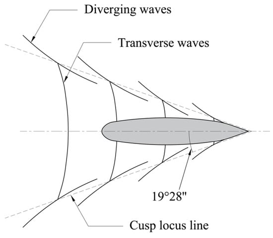 Figure 3 presents the basic ship wave system and field. When the deep Froude number, (where V is the ship speed, g is the acceleration due to gravity, and h is the water depth), is less than 0.84, the wave pattern is termed deep-water ship waves (Kelvin waves), while the ship is termed navigating in the subcritical speed zone. The Kelvin wave pattern consists of two distinct sets of diverging and transverse waves confined within a fan-shaped area behind the hull [24]. Transverse waves propagate in the same direction as ship movement, while diverging waves distribute symmetrically along the navigation direction with propagation angles approximately 55° from the course [25]. The wave crest cusp points form a cusp locus line at 19°28′ to the navigation direction, where maximum wave height occurs [26].