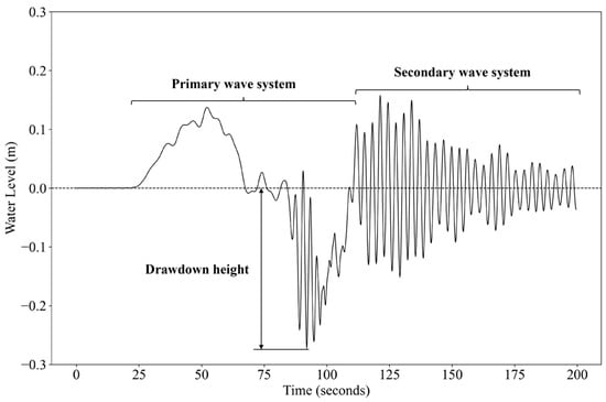 When a ship navigates through confined waters, two distinct wave phenomena emerge in the hydrodynamic system (Figure 4). The primary wave system develops as a reverse current beneath the hull generates a localized low-pressure fluid region surrounding the ship, which causes the drawdown wave. The secondary wave system, recognized as the Kelvin wave system, exhibits a dual nature: transverse waves advancing parallel to the ship’s trajectory and divergent waves propagating at angles approaching 90° relative to the ship’s motion. Generally speaking, the primary wave is of lower frequency and the secondary wave is of higher frequency. First systematically characterized by Thompson [28], this classical hydrodynamic phenomenon elucidates fundamental principles of ship wave interactions, with the transverse–divergent wave duality remaining a cornerstone in naval hydrodynamics research.