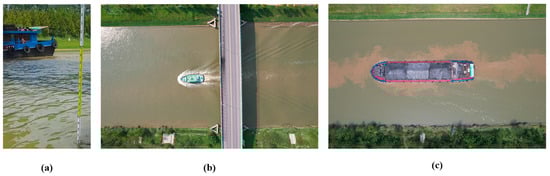 During the observation process, the wave form generated by the NAB and the CSs moving on the water surface was observed, and a camera was used to record the change process of the ship waves, and the corresponding distances from the observation point were collected. The other equipment included a 5 m long ruler with an accuracy of 0.01 m, used to measure water level (Figure 5a); a tripod (Qingzhuang Photographic Equipment Co., Ltd., Guangzhou, China) for fixing the camera; a laser rangefinder for measuring the distance from each ship to the observation point; and an unmanned aerial vehicle (UAV, Dajiang Innovation Technology Co., Ltd., Shenzhen, China) for aerial photography and recording the ship tracks. The observation point was located on a vertical revetment platform. Figure 5b,c present the NAB and CS recorded by the UAV.