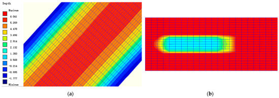 A waterway section of the Chengzi River including the observation section was selected for a generalized model setup. In order to make the model simulation close to the actual situation, the model range must be large enough to ensure that the ships pass through the simulation area of the observation section at a preset speed. Therefore, the length of the model section was set to 900 m. The model used a rectangular grid. After several tests, the grid size of the model along the shore was 5 m, and the grid size of the model perpendicular to the shoreline was 1 m. The water surface width of the waterway was set to 68 m with reference to the section design figure of the river section, and the model width was 88 m after considering the revetment. According to the multi-beam scanning section elevation data of the Chengzi River in 2023 and the water level during the field observation, the bathymetry of the model section was set. Figure 6a presents the grid and bathymetry of the model. According to the field observation data (Table 1), the ship-related parameters and the navigation track at a fixed distance from the shoreline were set. Figure 6b presents the form of the applied pressure field by a ship in the model, which matches the actual hull’s outline shape as much as possible. Moreover, it was assumed that there was no discharge input in the Chengzi River. Therefore, the initial flow velocity was zero.