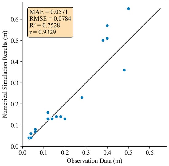 In the numerical model governing file, the output point corresponding to the field observation site was selected to output the water level changes, and the output time step was 0.1 s. The height of the highest water level of the primary wave was extracted as the wave height value of this point. Figure 7 presents the comparison between the observation data and the simulation results. The mean absolute error (MAE), root mean square error (RMSE), determination coefficient (R2) and Pearson correlation coefficient (r) were used to measure the simulation effect of the model. The comparison shows that the non-hydrostatic model of XBeach has a certain ability to simulate ship waves.