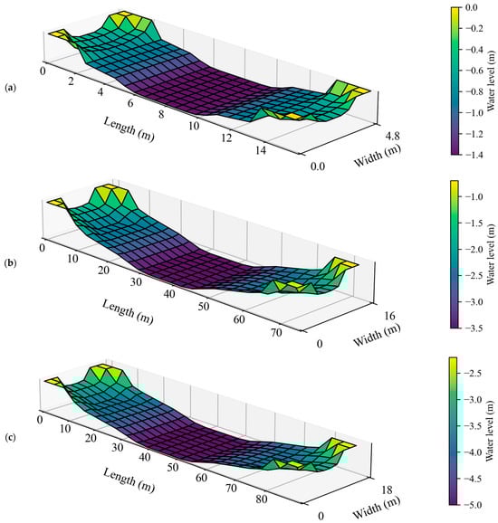 Table 2 lists the three ship types selected according to the design materials, including a NAB, a 2000-ton CS and a 5000-ton CS, which were all fully loaded. The models of in-water pressure field caused by each ship type’s draft are shown in Figure 8. By specifying the ship draft distribution in the ship grid, which is interpolated and converted to a water level drop in the XBeach model, the pressure field is thus generated. The speed of each ship type was set to the most common value. The input files of ship-related parameters were set according to the ship sizes and drafts. To avoid the influence of numerical instability on the simulation results, the ship track files described the ships’ navigation as slowly accelerating to maximum speed. The depth Froude number was calculated for each ship type. When considering the lowest navigable water level, was 0.76, 0.38, and 0.28, respectively, all of which meant that all ships were in the subcritical speed zone.