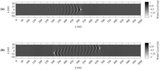 In recent years, many scholars have also chosen to use the XBeach model [4] to describe ship wave generation and propagation, considering that the XBeach model can provide a computationally efficient framework for ship wave simulations with simplified numerical approaches. De Jong et al. [5] has proved that XBeach is better than Delft3D-FLOW since it allows the calculation of passing-ship effects including non-linear shallow-water effects and the influence of arbitrary geometries. The capability of XBeach to predict the interaction between ships in complex channel geometries was validated through comparison with physical model experiments conducted by Zhou et al. [6]. Björn Almström et al. [7] compared XBeach against high-quality field measurements of ship waves and assessed its general applicability to ship wave simulations through an extensive sensitivity analysis with regard to the main input parameters. The result showed that XBeach is a robust model for ship wave applications with inputting available data. Bluteau et al. [8] proved that XBeach could model the evolution of the waves’ drawdown as they propagated over several kilometers from the channel. Mao and Li et al. [9] showed that the XBeach model is not only able to calculate the primary and secondary waves well, but also the ship-induced near-bed velocity when ship waves are prominent in the water flume.