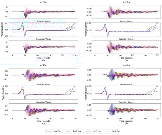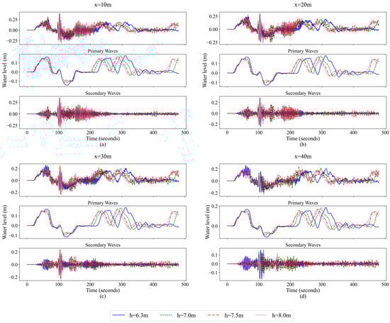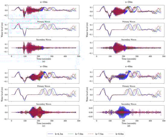 Water level changes at different water depths during the NAB navigation at (a) x = 10 m, (b) x = 20 m, (c) x = 30 m and (d) x = 40 m, and the primary and secondary waves separated by a third-order Butterworth filter.