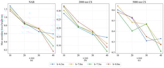When it is 2NOD for 2000-ton or 5000-ton CSs, the regular patterns of the primary waves varying with the water depth are similar to those when SN. However, compared with SN, the primary wave effect is more significant, almost doubled, while the max amplitude of the secondary waves is smaller than that of the primary waves. It is obvious that the energy is concentrated and easy to dissipate. The regular pattern of the secondary waves varying with the water depth is almost opposite to that of the NAB. As presented in Figure 15b,c, the maximum wave height of the secondary waves increases with the increase in water depth.