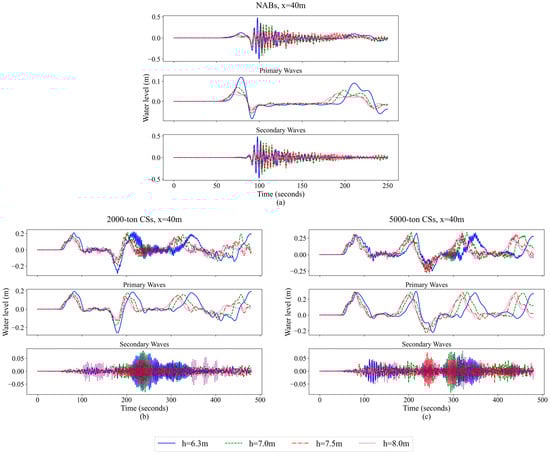 Water level changes at different water depths during the navigation of (a) NABs, (b) 2000-ton CSs and (c) 5000-ton CSs at x = 40 m, and the primary and secondary waves separated by a third-order Butterworth filter.
