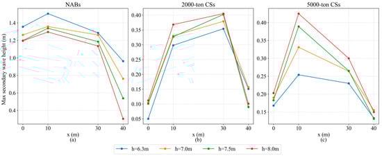 Comparison of the maximum wave heights along the cross-section at different water depths for the navigation of two (a) NABs; (b) 2000-ton CSs; (c) 5000-ton CSs.