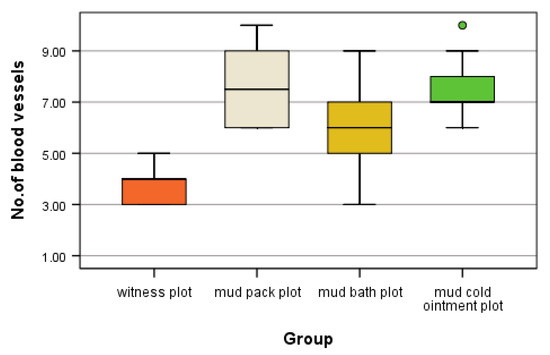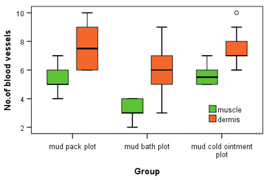 In muscle tissue, the cold mud ointment group exhibited the highest mean number of angiogenesis vessels, closely followed by the mud pack group. The skeletal muscle is highly vascularized and exhibits adaptive responses in microvessels based on the muscle demand. This finding suggests that the rapid alternations between heating and cooling in cold mud ointment therapy may be particularly effective in stimulating angiogenesis in deeper tissues. The contrast in temperature could promote swift transitions from vasodilation to vasoconstriction, potentially triggering adaptive responses in the muscular microvasculature.