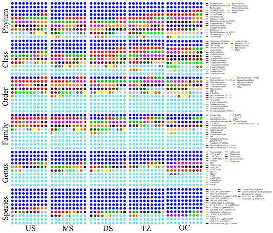 In this study, the 16S rRNA gene amplicon high-throughput sequencing technology combined with multidimensional bioinformatics analysis and obtained high-resolution amplicon sequence variants (ASVs) for visual analysis were used to systematically analyze the composition characteristics, spatial differences, functional metabolic potential of the sediment microbial community in the target area and its coupling mechanism with environmental factors [24]. To systematically analyze the changes in the percentage of microorganisms in different groups, this study presented the distribution of the top 20 species in terms of abundance in each group at six different levels: phylum, class, order, family, genus, and species. The microbial community composition at the phylum level across the five sample groups (US, MS, DS, TZ, OC) revealed distinct taxonomic patterns (Figure 2). At the phylum level, Firmicutes dominated freshwater zones (US: 38.2%, MS: 34.5%), likely due to their prevalence in anaerobic, sulfate-rich sediments (e.g., Desulfovibrio spp.) [12]. In contrast, Bacteroidetes increased in brackish zones (DS: 29.1%, TZ: 33.7%), correlating with elevated organic matter degradation [34]. Marine zones (OC) showed a marked shift toward Proteobacteria (26.8%), particularly Gammaproteobacteria, known for their halotolerance and metabolic versatility in saline environments [20]. At the class level within Firmicutes, the class Clostridia (US: 28.4%, MS: 25.1%) dominated freshwater sediments, suggesting active fermentation and sulfate reduction [12]. In marine zones, Gammaproteobacteria (OC: 21.3%) prevailed, aligning with their role in aerobic heterotrophy and sulfur cycling [35]. Brackish zones (TZ) exhibited a mix of Bacteroidia (18.9%) and Alphaproteobacteria (12.5%), indicating transitional metabolic strategies [36]. The order Desulfovibrionales (phylum Firmicutes) was enriched in US (15.2%) and MS (13.8%), supporting sulfate reduction under low-oxygen conditions [12]. In OC, Alteromonadales (order within Gammaproteobacteria) accounted for 9.7% of sequences, reflecting adaptations to high salinity and organic carbon availability [20]. Families such as Desulfovibrionaceae (US: 12.1%) and Rhodocyclaceae (TZ: 8.4%) highlighted niche-specific functions—sulfate reduction in freshwater and denitrification in brackish zones, respectively. The marine family Vibrionaceae (OC: 6.9%) was linked to polysaccharide degradation in algal-rich habitats. Key genera included Desulfovibrio (US: 10.5%), Thiobacillus (TZ: 7.2%), and Pseudomonas (OC: 5.8%). Desulfovibrio’s dominance in freshwater zones correlated with sulfate reduction [12], while Thiobacillus in TZ suggested sulfur oxidation under fluctuating redox conditions. Pseudomonas in OC indicated hydrocarbon degradation potential [37]. Species-level resolution revealed Desulfovibrio vulgaris (US: 4.3%) and Thiobacillus thioparus (TZ: 3.1%) as functional markers for sulfate reduction and sulfur metabolism, respectively. Marine zones harbored Pseudomonas aeruginosa (OC: 2.9%), a known hydrocarbon degrader, underscoring anthropogenic pollutant impacts [37].