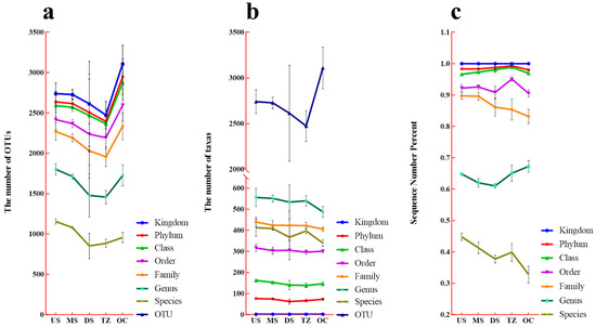 Taxonomic annotation profiles at six classification levels. (a) Operational Taxonomic Unit (OTU) richness. (b) Taxonomic richness (phylum to species). (c) Percentage distribution of sequence reads among dominant taxa.