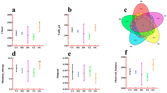 Alpha diversity indices and shared microbial taxa across zones. (a) Chao1 (richness estimator). (b) Faith’s Phylogenetic Diversity (Faith_pd). (c) Venn diagram of shared/unique OTUs. (d) Shannon diversity (entropy). (e) Simpson evenness. (f) Observed features (species count). * p < 0.05, ** p < 0.01.