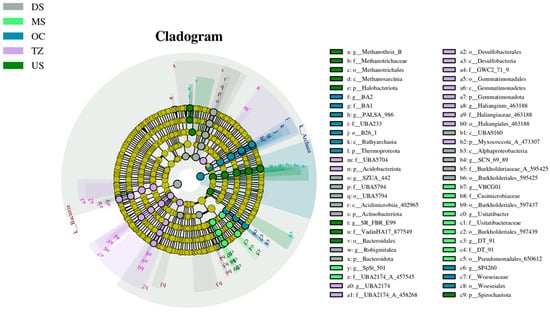 LEfSe analysis identified phylogenetically conserved microbial biomarkers that exhibited significant abundance disparities across groups, as visualized in the cladogram (Figure 5). Key discriminatory taxa spanned multiple taxonomic ranks, including methanogenic archaea and metabolically versatile bacteria. Notably, Methanothrix_B (genus) and its higher taxonomic relatives (Methanotrichaceae, Methanotrichia; nodes a–c) were enriched in anaerobic zones (LDA > 4.0, p < 0.005), suggesting their role as methanogenesis specialists. In contrast, Acidobacteriota (phylum; node n) and Actinobacteriaceae (family; node s) dominated oxic habitats (LDA > 3.8, p < 0.01), aligning with their known aerobic chemoorganotrophic lifestyles [52].