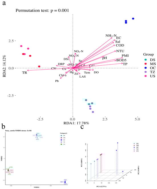 Multivariate analyses revealed significant associations between microbial community structure and environmental factors (Figure 6). Redundancy analysis (RDA; Figure 6a) demonstrated strong constraints imposed by environmental variables, with the first two axes explaining 31.9% of the total variance (permutation test: p = 0.001) [58]. Key drivers included nitrogen availability (NDA1: 17.78%, NDA2: 14.12%) and redox potential (NRD3: 16.04%), which collectively shaped taxonomic composition [59]. Non-metric multidimensional scaling (NMDS; Figure 6b) confirmed clear separation of communities across environmental gradients (stress = 0.18), with organic-rich and oligotrophic clusters occupying distinct ordination spaces [60]. Principal component analysis (PCA; Figure 6c) further corroborated these patterns, where PC1 (42.1% variance) correlated positively with nutrient levels (e.g., total carbon, nitrate) and negatively with salinity [20]. Notably, 63% of NRD variables (e.g., NRD1–NRD202) exhibited uniform contributions (17.78%) to community variation, suggesting broad-scale environmental filtering rather than dominance by singular factors [61]. Thermophilic and halophilic taxa clustered along high-temperature/high-salinity vectors [49], while copiotrophic groups aligned with nutrient-rich regions [59]. The tight coupling between microbial communities and environmental parameters underscores the deterministic nature of assembly processes in this system [62]. The prominence of nitrogen dynamics (NDA1/NDA2) aligns with prior studies highlighting nitrogen as a master variable in structuring microbial niches, particularly through its role in amino acid synthesis and energy metabolism [63]. The uniform influence of NRD variables implies that redox heterogeneity—rather than extreme values—drives microbial diversity, fostering functional redundancy across microhabitats [64]. The NMDS/PCA convergence on nutrient–salinity axes reflects ecological trade-offs: nutrient-rich habitats favor fast-growing copiotrophs (e.g., Proteobacteria), while oligotrophic zones select for stress-tolerant specialists (e.g., Actinobacteria) [65]. This mirrors global patterns in soil and aquatic microbiomes, where resource availability inversely correlates with phylogenetic diversity [20].
