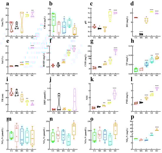 Water quality monitoring data. (a) Temperature (Tem). (b) Chlorophyll-a (ChI-a). (c) pH. (d) Dissolved oxygen (DO). (e) Salinity (Sal). (f) Biochemical oxygen demand (5-day) (BOD5). (g) Chemical oxygen demand (COD). (h) Total phosphorus (TP). (i) Transparency (TR). (j) Dissolved reactive phosphorus (DRP). (k) Nephelometric turbidity unit (NTU). (l) Permanganate Index (PMI). (m) NO2-N. (n) NO3-N. (o) NOX-N. (p) Ammonia nitrogen (NH3-N). * p < 0.05, ** p < 0.01, and *** p < 0.001.