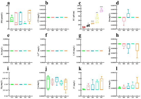 Water quality monitoring data. (a) Dissolved silica (DSi). (b) CN−. (c) Electric conductivity (EC). (d) Zn. (e) Se. (f) Cr+. (g) Anionicsur factant (LAS). (h) Pb. (i) Hg. (j) Cu. (k) F−. (l) Cd. * p < 0.05, ** p < 0.01, and *** p < 0.001.