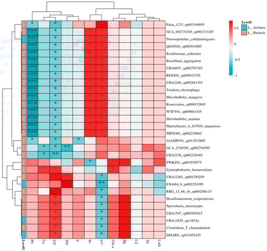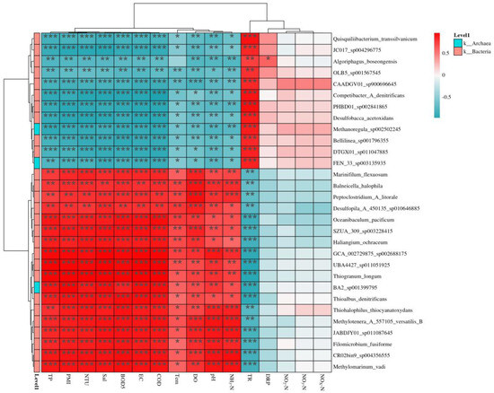 Correlation_heatmap between bacterial abundance and environmental factors. * p < 0.05, ** p < 0.01, and *** p < 0.001.