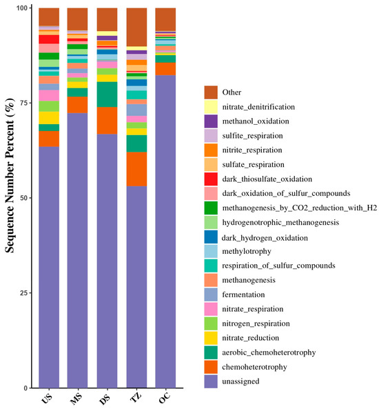 Functional prediction of microbial metabolic pathways revealed distinct biogeochemical potentials across the estuarine gradient (Figure 11). US and TZ exhibited enrichment in methanogenesis and cellulose degradation, aligning with high organic carbon inputs from terrestrial runoff [88,92]. MS and DS habitats showed dominance of denitrification and polycyclic aromatic hydrocarbon degradation, correlating with anthropogenic nitrate and urban pollutant loads [87,93]. OC habitats were marked by sulfur metabolism and osmoregulation pathways, reflecting saline adaptation and marine organic matter cycling [94]. Notably, antibiotic resistance genes and heavy metal detoxification pathways peaked in DS, coinciding with elevated Zn (16.8 μg/L) and NH3-N (1.5 mg/L) [89,95].