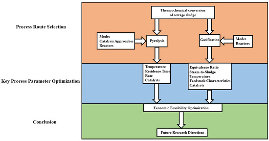 This article is structured according to the technological roadmap (Figure 1) and reviews the progress of thermochemical treatment technologies for sewage sludge, focusing on the potential of thermochemical conversion in realizing sludge resource utilization and reducing environmental burdens. It also discusses the understanding of sludge value-added through different thermochemical processes, with a focus on pyrolysis and gasification as the two main thermochemical conversion technologies due to their higher technological maturity, scalability, and practical relevance in current industrial applications. In contrast, although hydrothermal technologies show greater potential for treating wet biomass, they typically require high-pressure reaction systems, involve complex reactor designs, and pose higher operational risks, which have limited their commercial deployment.