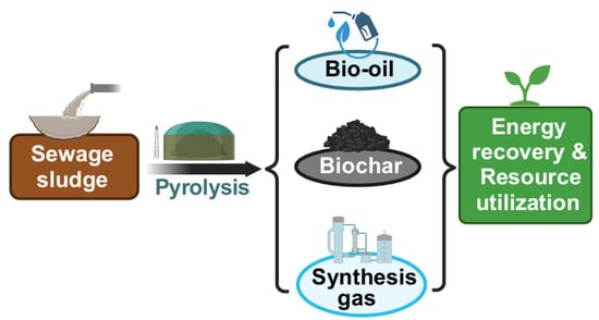 Pyrolysis of sewage sludge is a process of thermal degradation of chemical molecules in sewage sludge under high temperature and inert atmosphere, with the reaction temperature ranging from 300 °C to 1000 °C. This process converts high-molecular-weight carbon-containing substances in sewage sludge into small molecules, and the main products are bio-oil, low-molecular-weight gases, and solid fractions [77,78]. Due to its ability to generate renewable energy and concentrate heavy metals in the final products, pyrolysis technology is regarded as an environmentally friendly technology.