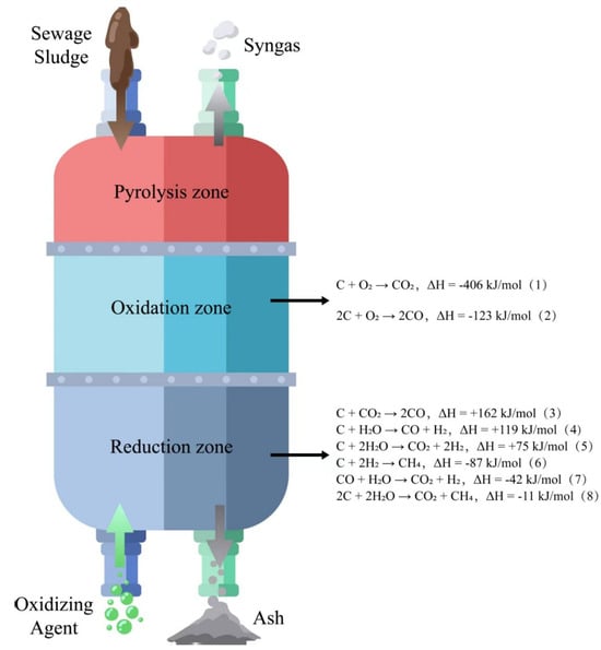 Gasification is a purely chemical reduction process, mainly divided into four stages: drying (70–200 °C, to remove moisture), pyrolysis (350–500 °C, generating coke, volatiles, and gases), oxidation (providing necessary heat), and reduction (converting pyrolysis products into permanent gases) [110,111]. The chemical reactions occurring in the oxidation zone and reduction zone are, respectively, shown in Figure 4 [111].