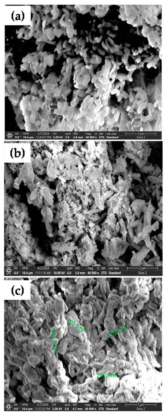 The optical properties of the synthesized materials were analyzed using UV-Vis spectroscopy (Schimadzu, Tokyo, Japan). This technique was employed to investigate the absorption spectrum, which provides insights into the electronic structures and optical bandgaps of the as-synthesized materials, essential for evaluating its photocatalytic potential. Measurements were performed over the 200–500 nm range to enable detailed analysis of light absorption behavior.