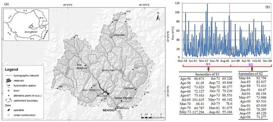 (a) The map of Romania, on which is indicated the catchment location, (b) the data series indicating the subseries S1 and S2, and the aberrant values of S1 and S2.