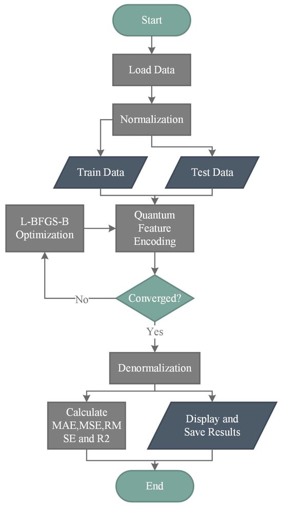- Parameter optimization: the process uses classical algorithms (e.g., L-BFGS-B [,], COBYLA [,], and Adam []) to optimize the parameters of quantum circuits using the equation:where η is the learning rate.The parameter θ is optimized through iterative training to minimize the regression error and finally obtain the optimal model.
