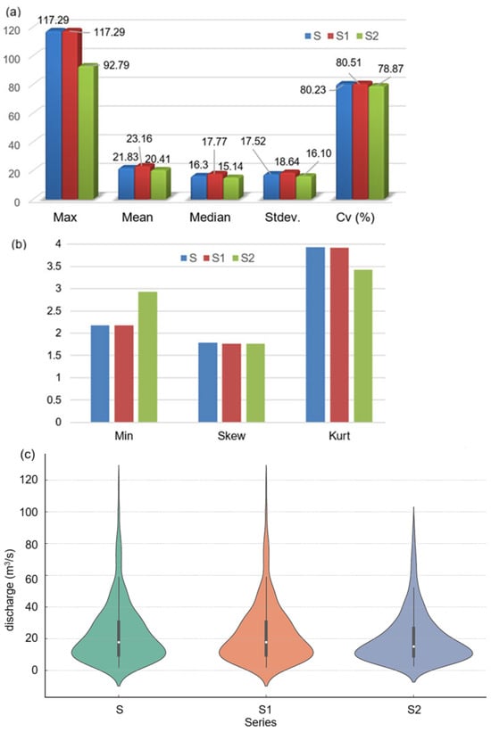 (a) Maximum (Max) [m3/s], mean [m3/s], median [m3/s], standard deviation (Stdev) [m3/s], and coefficient of variation (Cv%); (b) minimum (min) [m3/s], skewness (Skew), and kurtosis coefficients (Kurt) of the series and its subseries; (c) violin plot of S, S1, and S2 series.