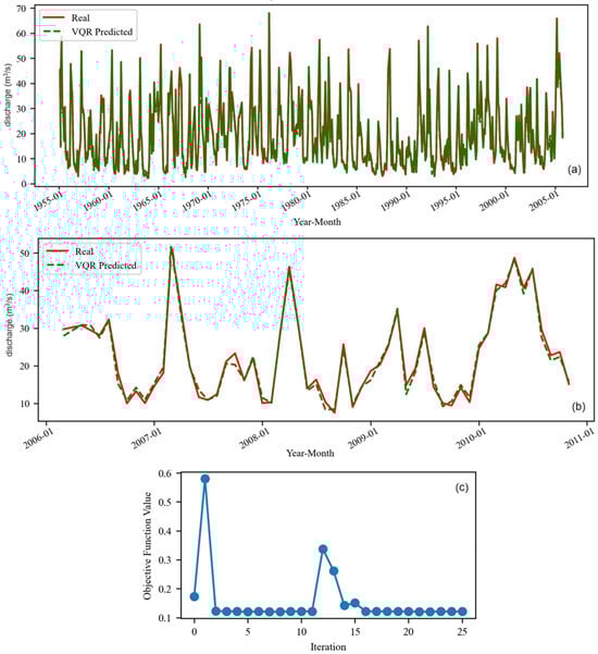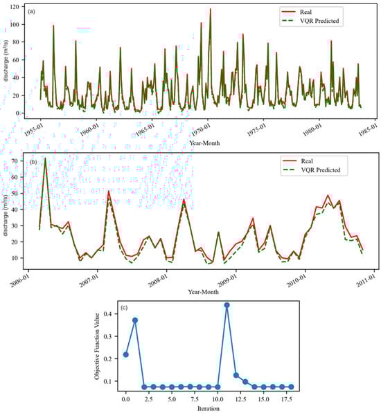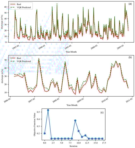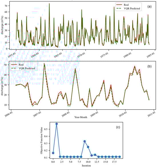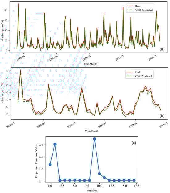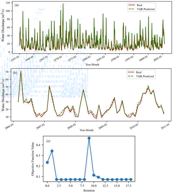 Given the limited literature on hydrological modeling using quantum computing and the findings that VQR can provide compressed and nonlinear regression mappings in domains involving signal processing [] (univariate time series might be considered nonlinear signals), we developed three VQR-based models for monthly river discharge data from 1955 to 2010 from the Buzău River (Romania). This study aimed to evaluate the suitability of VQR for hydrological forecasting by benchmarking the models against previous results obtained from classical approaches on the same dataset. The motivation stemmed from the inability of traditional AI and hybrid models to accurately predict monthly discharge values, especially in months with high water and floods. Our findings demonstrate that the quantum models outperformed classical neural networks and hybrid models, highlighting VQR’s potential advantages in this domain.