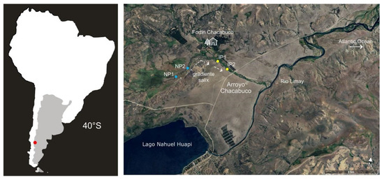 Map with sampling sites in Chacabuco stream, NW Patagonia, Argentina: Native plot 1 (NP1), Native plot 2 (NP2), Invasive plot 1 (IP1) and Invasive plot 2 (IP2). Dotted arrow shows Salix spp. trend.