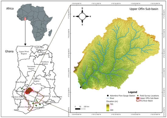 Figure 1. Location and topography of the Upper Offin sub-basin in the Pra River Basin of Ghana.