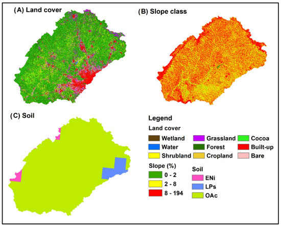 Figure 2. Spatial catchment characteristics of the Upper Offin sub-basin; (A) land cover, (B) slope classes, (C) soil.