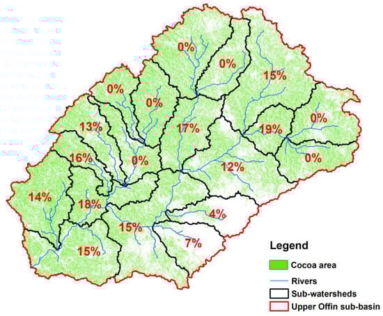 Figure 5. Percent of sub-watersheds in the Upper Offin sub-basin where supplemental irrigation was applied to the cocoa area in SWAT. Note that the number in the map represents the percent area of each sub-watershed under supplemental irrigation.