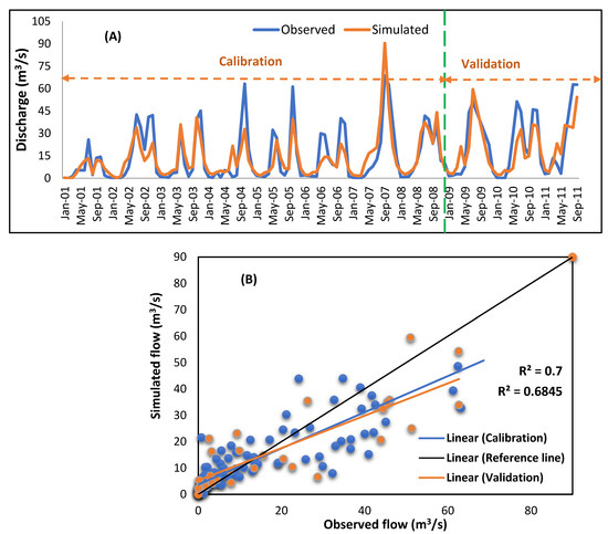 Figure 6. Time series (A) and scatter plot (B) for the calibration (2001 to 2008) and validation (2009 to 2011) of monthly streamflow results at the Adiembra gauging station. The green broken line indicates the border of the time period for calibration and validation.