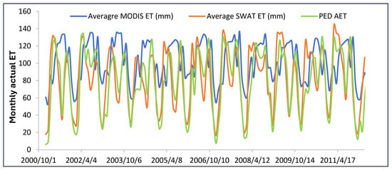 Figure 7. Monthly time series comparing the spatial average MODIS ET, average SWAT ET, and PED AET in Upper Offin sub-basin.