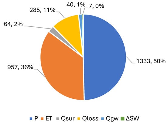 Figure 8. Hydrologic responses of the Upper Offin sub-basin. P, ET, Qsur, Qloss, Qgw, and ∆SW were precipitation, evapotranspiration, surface runoff, percolation, lateral sub-surface flow, and change in soil water, respectively. All units are in mm or (%).