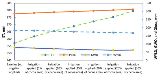 The results depicted the impacts of different supplemental irrigation scenarios on water resources and the environment. Figure 9 demonstrates how expanding cocoa supplemental irrigation fundamentally alters the hydrological process. For instance, a significant expansion of irrigated cocoa area to 30% of the total cocoa area resulted in noticeable shifts in the water balance components. We observed a 2.3% increase in actual ET, indicating enhanced water consumption by irrigated cocoa plants, and a 9% increase in Qloss. The increase in percolation from the baseline indicates that some of the irrigation water applied infiltrates deeper to the soil profile.
