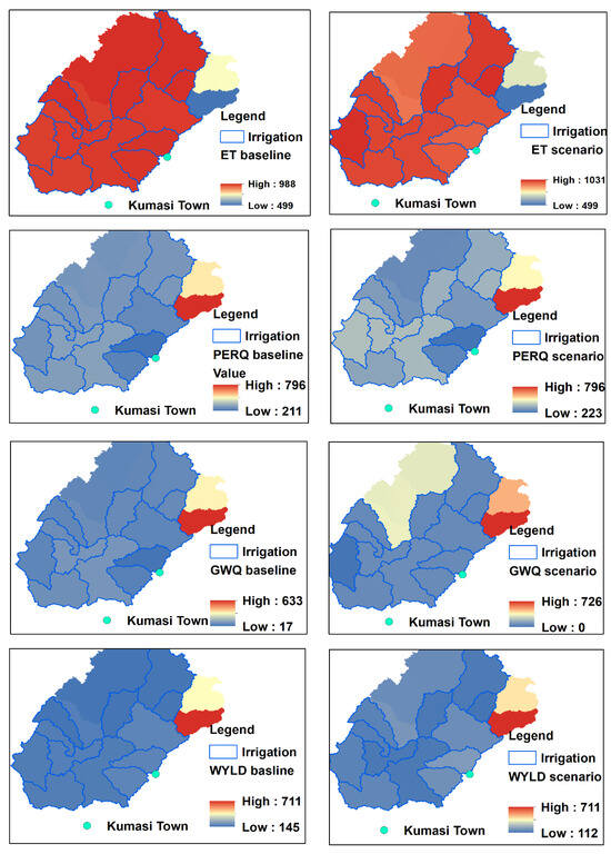The spatial hydrological responses of the baseline scenario showed that two sub-watersheds, northeast of the Upper Offin, showed uniquely different hydrological responses (Figure 10, left). Catchment water yield, groundwater flow, and percolation were observed to be high compared to the other parts of the Upper Offin sub-basin, while evapotranspiration was low. This was mainly due to the soil characteristics, such as Leptosol soil (Figure 2C), which is under hydrologic group B and has a good infiltration capacity. The dominant soil of Upper Offin is under hydrologic group C. Percolation and groundwater flow were low, while surface runoff was high in the southeast of the Upper Offin watershed, where built-up areas and bare lands are dominant (Figure 2A). Kumasi, the second largest city in the country, is in the southeast of the Upper Offin sub-basin. These findings underscore the need for careful management of irrigation practices to balance crop water needs with the sustainability of groundwater resources, particularly in areas with varying soil characteristics and land use patterns.