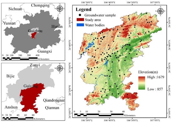 Guizhou Province, located in the Yunnan–Guizhou Plateau, is one of the three largest karst regions in the world, with carbonate rocks accounting for 71.7% of its total area. The study area, Guiyang City, is located in the center of Guizhou Province, covering an area of 2527.32 km2, with exposed carbonate rocks making up 74.68% (Figure 1). The study area has a subtropical humid and temperate climate, with an average temperature of 15.3 °C, extreme highs of 39.5 °C, and lows of −9.5 °C. It has an annual average of 1148.3 h of sunshine and records minimal snowfall. This area has an unevenly distributed annual precipitation averaging 1136.96 mm, peaking during the rainy season from April to October, while the dry season spans from December to March. The terrain is varied, being higher in the north and south, with elevations ranging from 800 m to 1600 m. Geologically, the study area is characterized by significant uplift during the Early and Middle Paleozoic, resulting in the widespread absence of the Devonian, Silurian, and parts of the Carboniferous and Ordovician strata across most of the region. In several locations, the Lower Carboniferous or Permian strata are in direct contact with underlying Cambrian or Ordovician rocks. The widespread distribution of carbonate rocks fosters active karst features like sinkholes and underground rivers, increasing the region’s susceptibility to surface pollution. As urbanization progresses, exemplified by three operational urban rail transit lines as of March 2024, the risks of groundwater contamination have heightened, highlighting the need for focused studies on GV in this karst-rich municipal area.