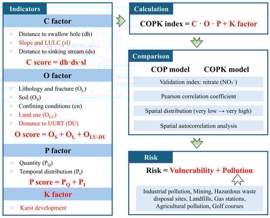 Figure 2 illustrates the methodological framework of this study. Based on the traditional COP model, we introduced three additional factors: distance to UURT, LULC, and karst development (K). They were integrated into the vulnerability index calculation to formulate the improved COPK model. Nitrate (NO3−), as a commonly used groundwater quality parameter, was employed to validate and compare the performance of the modified COPK model against the COP model. Finally, by combining the COPK results with various PPSs, regional groundwater risk was assessed, resulting in a spatial risk zoning map.