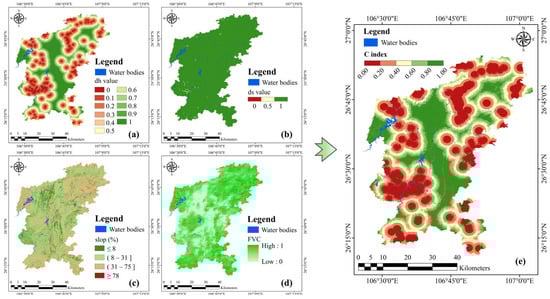 C factor and corresponding indicator distribution. (a) Distance to sinkholes (); (b) distance to sinking stream (); (c) slope; (d) vegetation; (e) C factor distribution.
